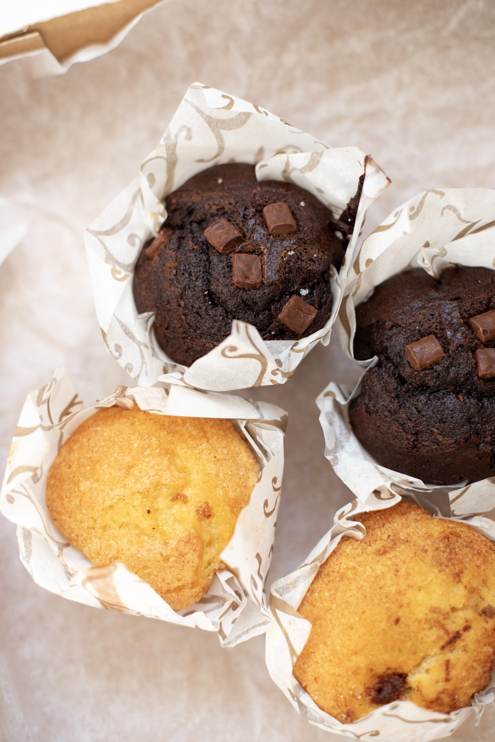 Velg mellom saftig eplemuffins med eplebiter eller fyldig sjokolademuffins. Begge er bakt lokalt og passer perfekt til møte, lunsj eller dessert.